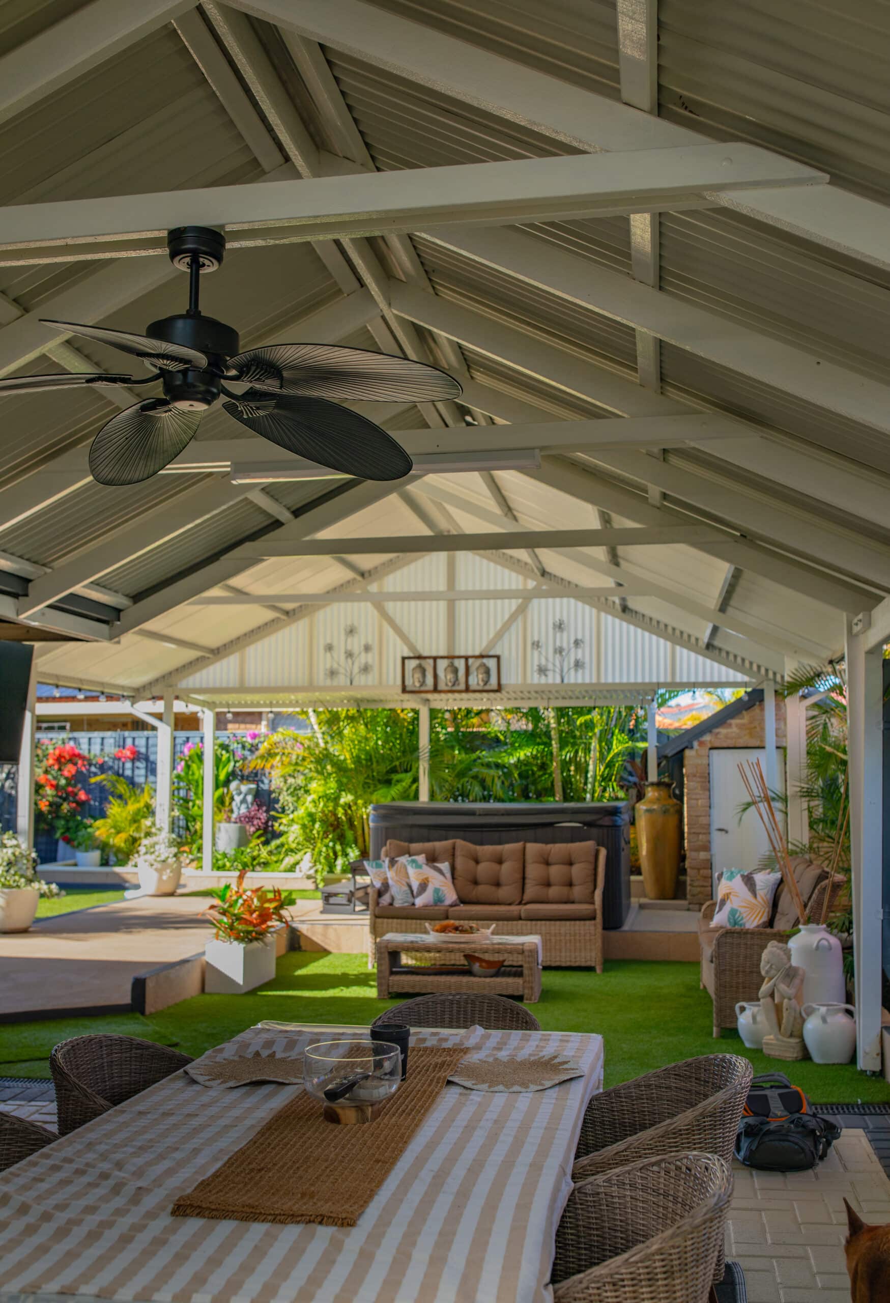 A gable patio features a pitched roof with two sloping sides that meet in the middle. This creates extra head height, better airflow and a spacious feel, making it ideal for outdoor entertaining areas where you want a more open, architectural look.